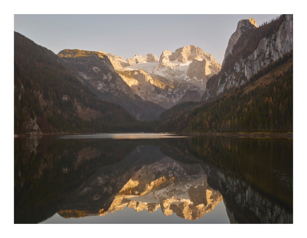 Diese Kunstfotografie zeigt die Spiegelung des Dachsteinmassivs im Gosausee in Österreich. Das warme Abendlicht und die ruhige Wasserfläche schaffen ein Bild von beeindruckender Klarheit und Tiefe. Als Fine Art Print eignet sich das Werk ideal für Interior Design, Wandkunst und hochwertige Wanddekoration – Fotokunst, die Räume mit Ruhe und Präzision erfüllt.