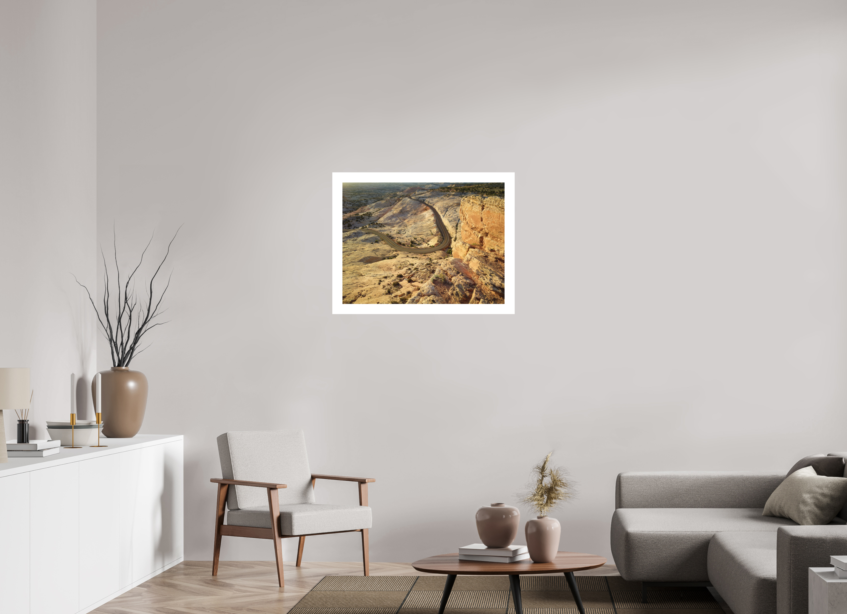 Der Highway 12 bei Escalante im Sonnenaufgang: geschwungene Linien kontrastieren mit hellem Sandstein und rötlichen Klippen. Diese Kunstfotografie verbindet Dynamik und Klarheit und eignet sich hervorragend als Fine Art Print für Interior Design. Als hochwertige Fotokunst bringt das Motiv Struktur, Weite und Ausdruckskraft in die Wandgestaltung und bereichert moderne Räume als exklusive Wanddekoration.