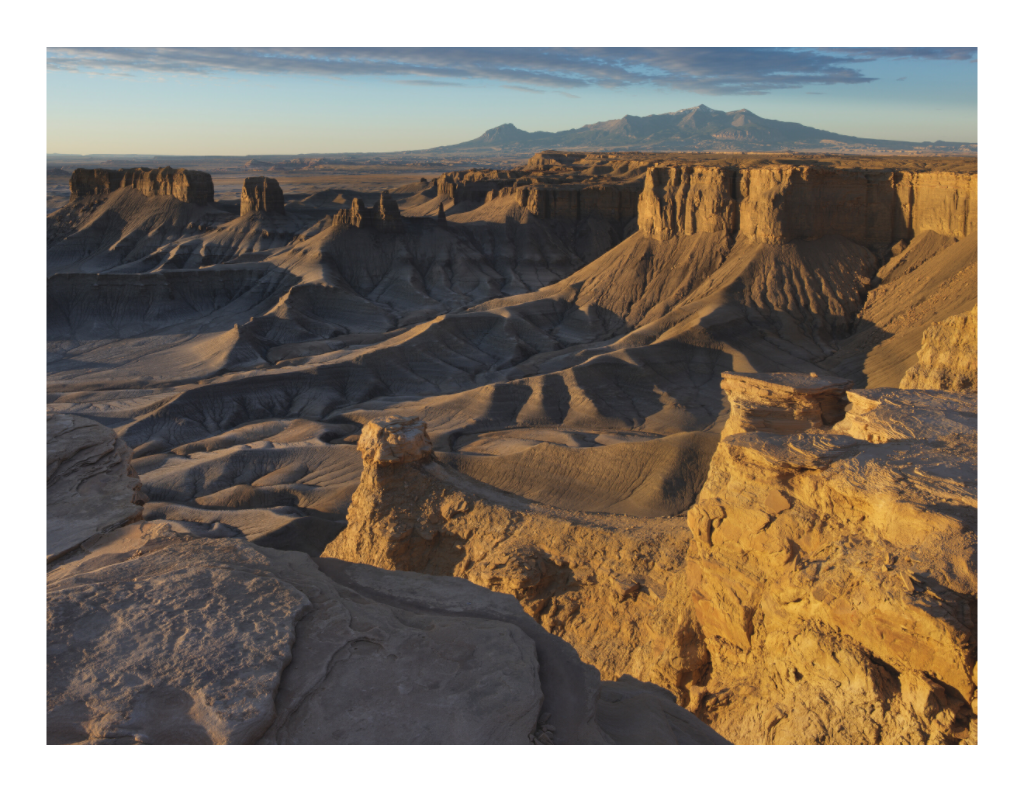 Dominant sind warme Gold- und Sandtöne im Vordergrund, die in kühle Grau- und Blaunuancen der Ferne übergehen. Der Farbverlauf von Licht zu Schatten schafft Tiefe und betont die skulpturale Struktur der Landschaft.