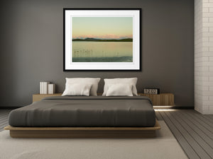 Minimalistisch, stabil und edel. Die Fotografie wirkt „schwebend“ vor der Wand, ohne sichtbaren Rahmen – perfekt für zeitgenössisches Interior Design.