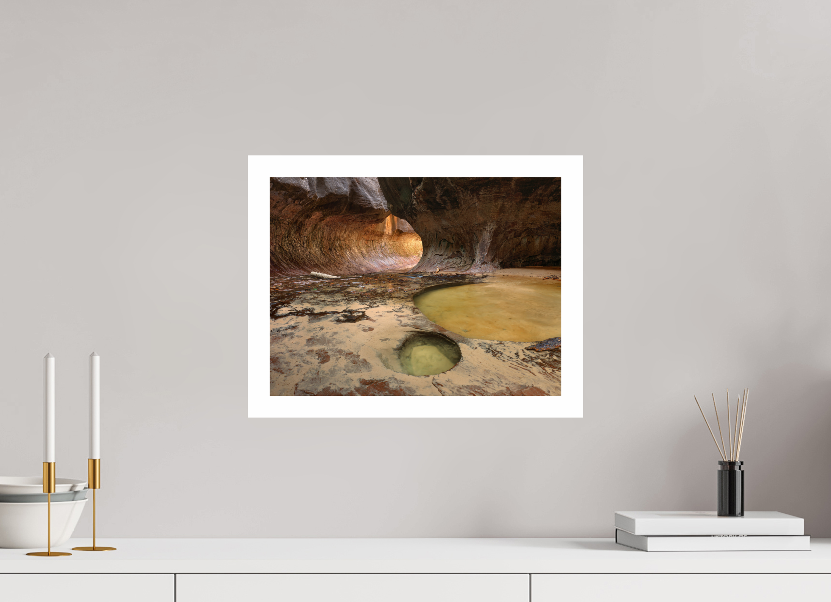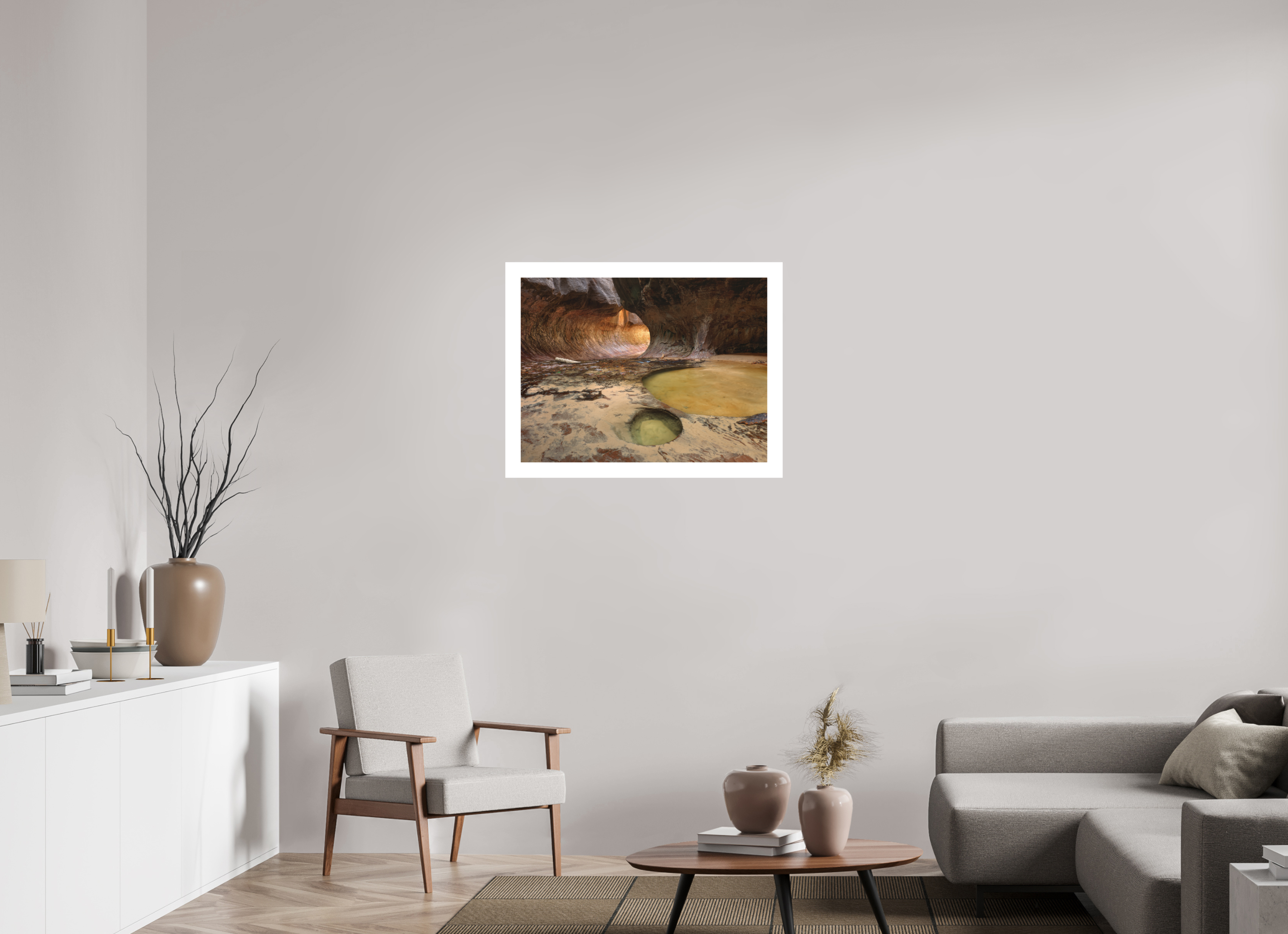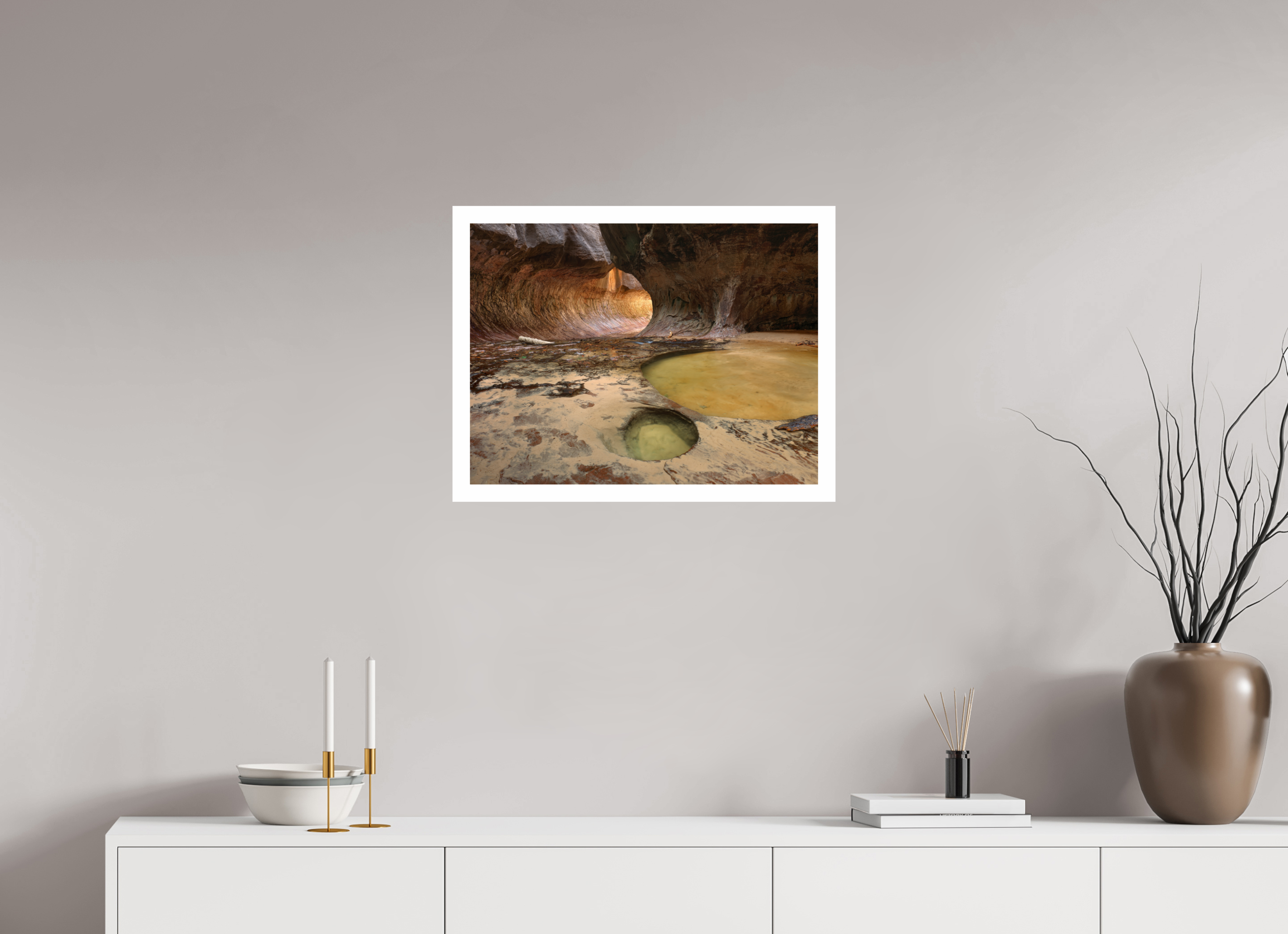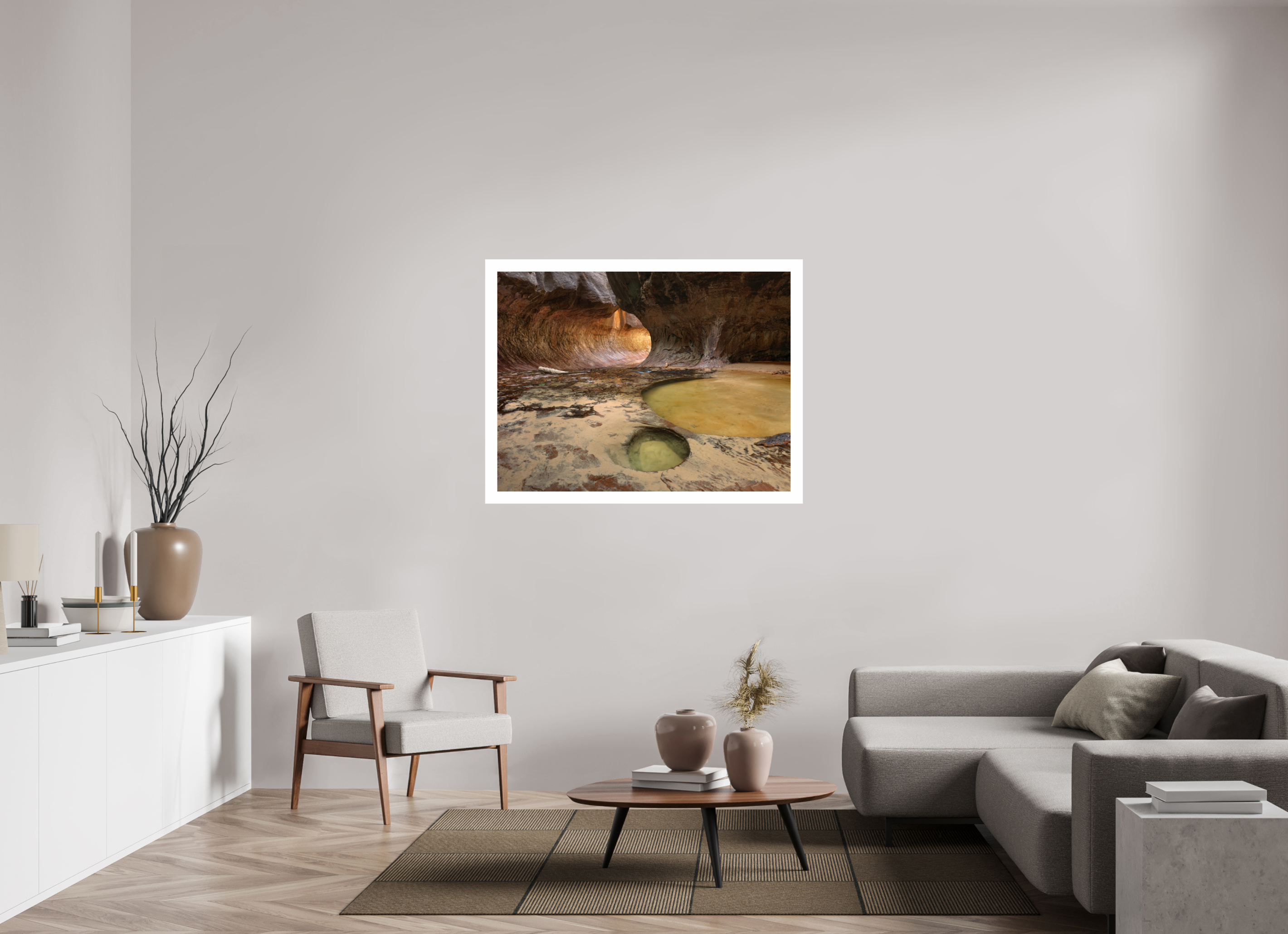 Minimalistisch, stabil und edel. Die Fotografie wirkt „schwebend“ vor der Wand, ohne sichtbaren Rahmen – perfekt für zeitgenössisches Interior Design. - Rahmung mit Passepartout